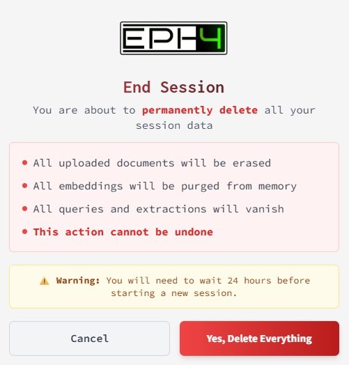 EPH4 Ephemeral RAG Pipeline deletes all session data and documentation, all of your information is secure while you analyze it and its fully deleted from databases once you are done. No data, no exposure.