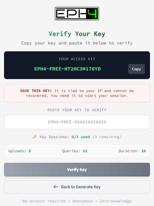 EPH4 is a system built for analyzing sensitive and lengthy files through secure RAG pipelines. Ephemeral AI Analysis and Internet 4 Mixed on a system built for seamless data privacy and compliance